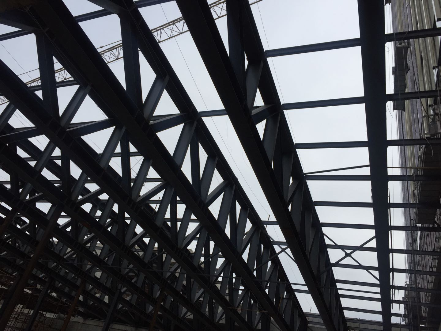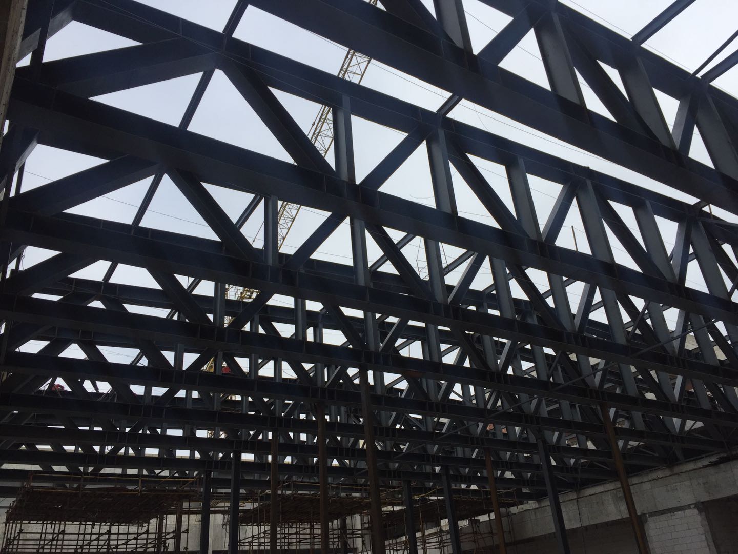 項目總占地面積19.98畝,其主體擬建一座五星級賓館,總建筑面積約61150平方米(其中地上40235平方米,地下20915平方米)。地下2層,主樓地上24層,建筑高度98m,裙房地上5層,建筑高度32m。裙樓鋼結構屋蓋為空間桁架結構,包含16榀平面桁架及桁架間垂直及水平支撐。桁架最高點處標高32.138m,長度31m,高度2.2m~2.96m之間,桁架下弦支承于標高28.772m的混凝土梁上。